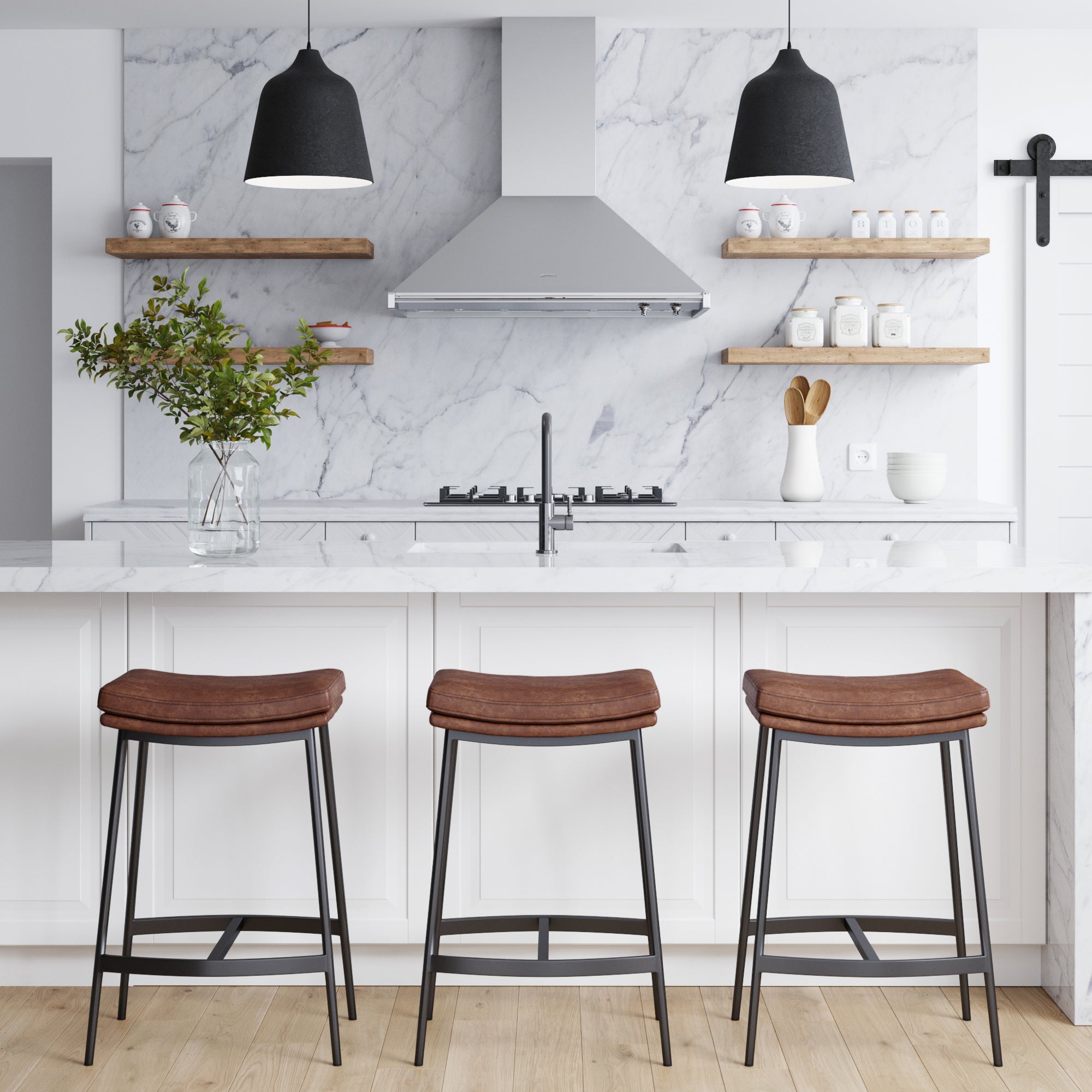 Rustic and modern all at the same time. the Arlo bar stool will bring out a level of sophistication to your kitchen island or breakfast nook you didn't know existed. Its double layered saddle seat provides optimal comfort. while the perfectly placed footrests give you the perfect excuse to sip on that glass of rosé a little while longer. The curved vintage brown seat is supported by an airy black powder-coated base that is strong enough to hold you or the occasional napping cat (275 lbs or lighter. please!). The Arlo stool may be just the final touch to complete your modern farmhouse kitchen!