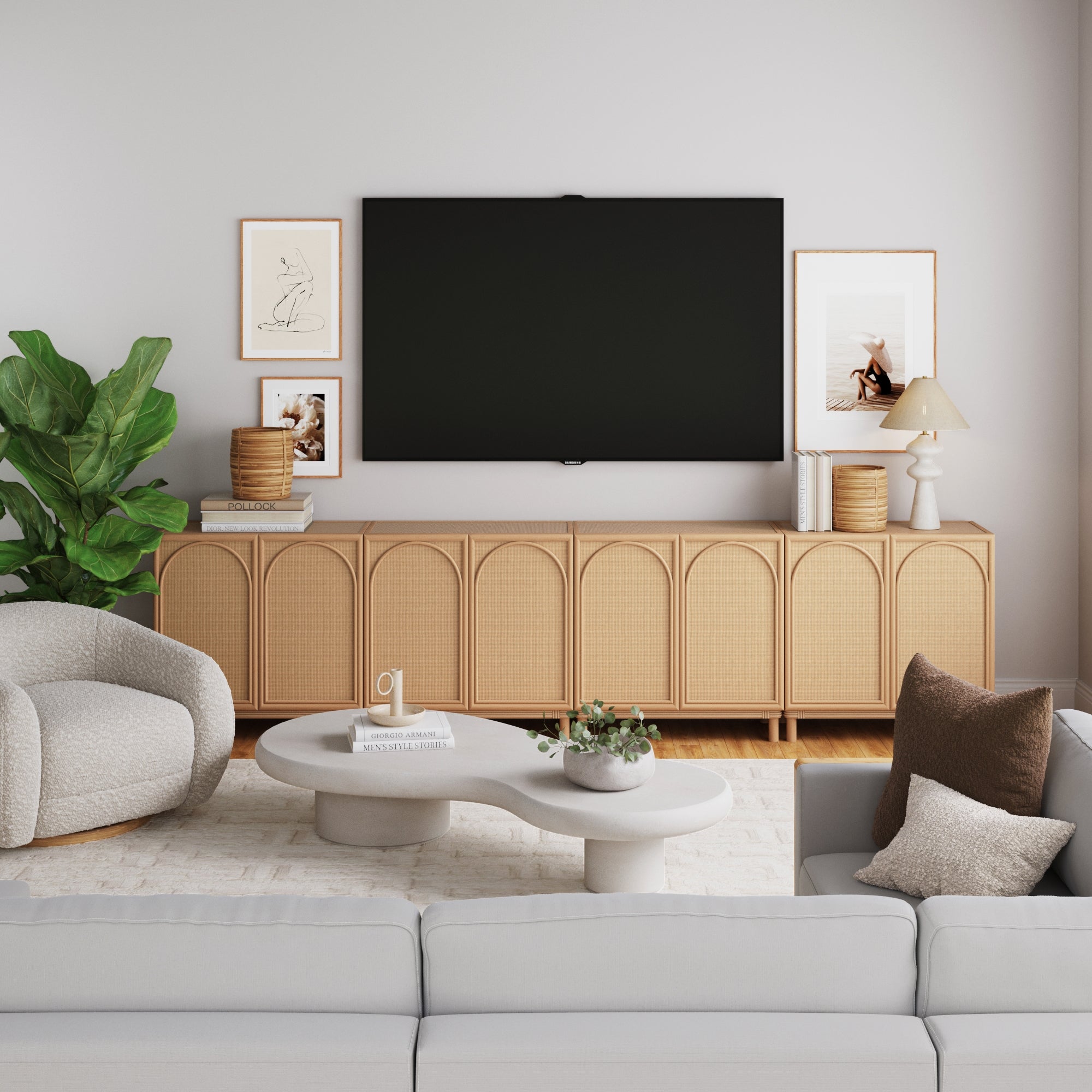 Introducing the Katouche Storage Cabinet. Crafted with rich wood veneer and elegant natural rattan inlays. this cabinet brings warmth and texture to any space. Its solid wood legs and door frames ensure durability. while the integrated handle cutouts add a sleek. modern touch. Inside. you'll find an adjustable shelf to suit your storage needs. Plus. thanks to the natural variations in wood. every Katouche piece is uniquely yours. with its own one-of-a-kind character.