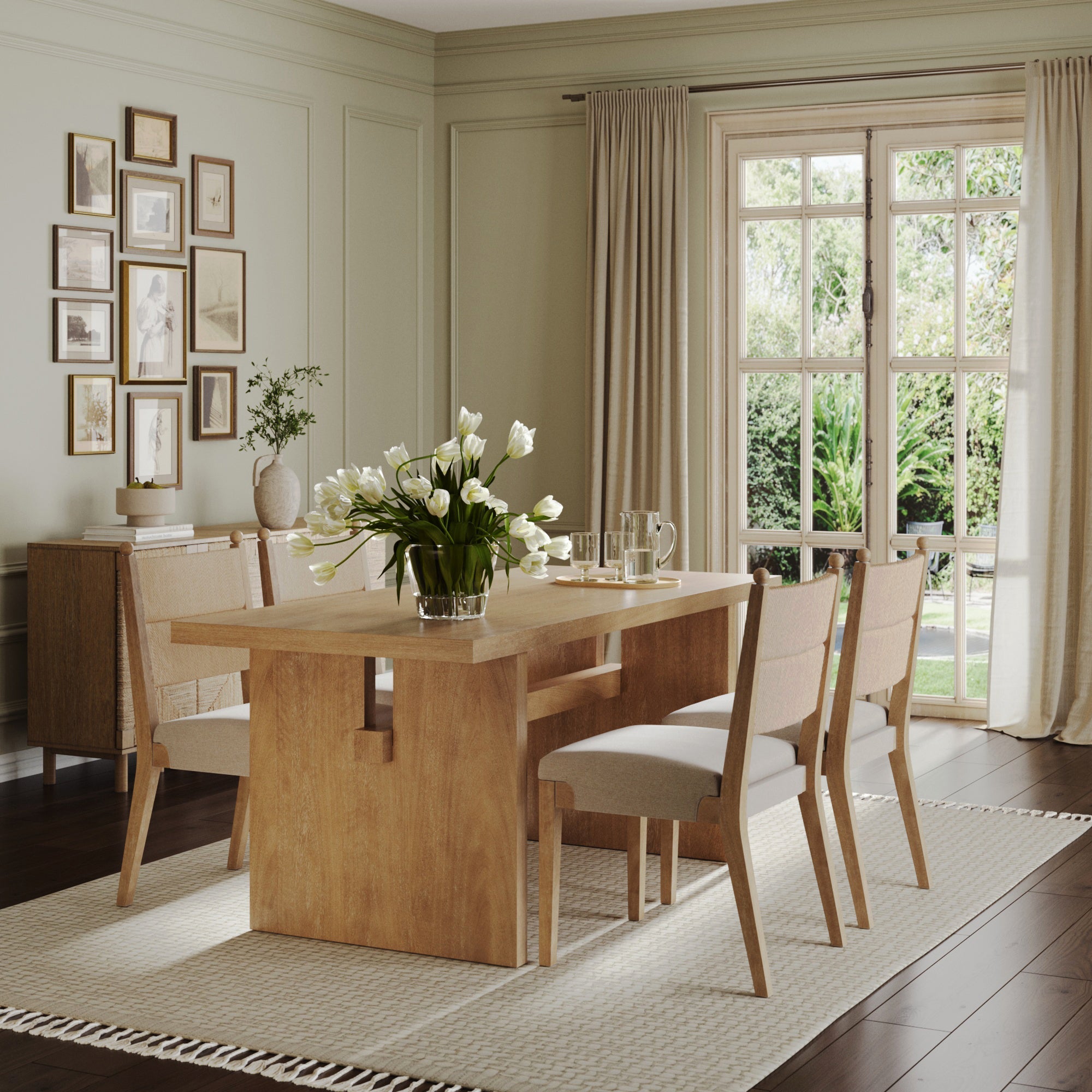 Bring coastal charm and comfort to the table with the Cove Dining Chair. Its 19-inch seat height is perfect for lingering meals. while the woven synthetic seagrass backrest and wraparound upholstered cushion offer breezy style and lasting comfort. A solid wood frame with tapered legs ensures durability. and natural variations in the wood make each chair one of a kind. Whether it's a lively gathering or a quiet dinner. Cove makes every seat feel special.