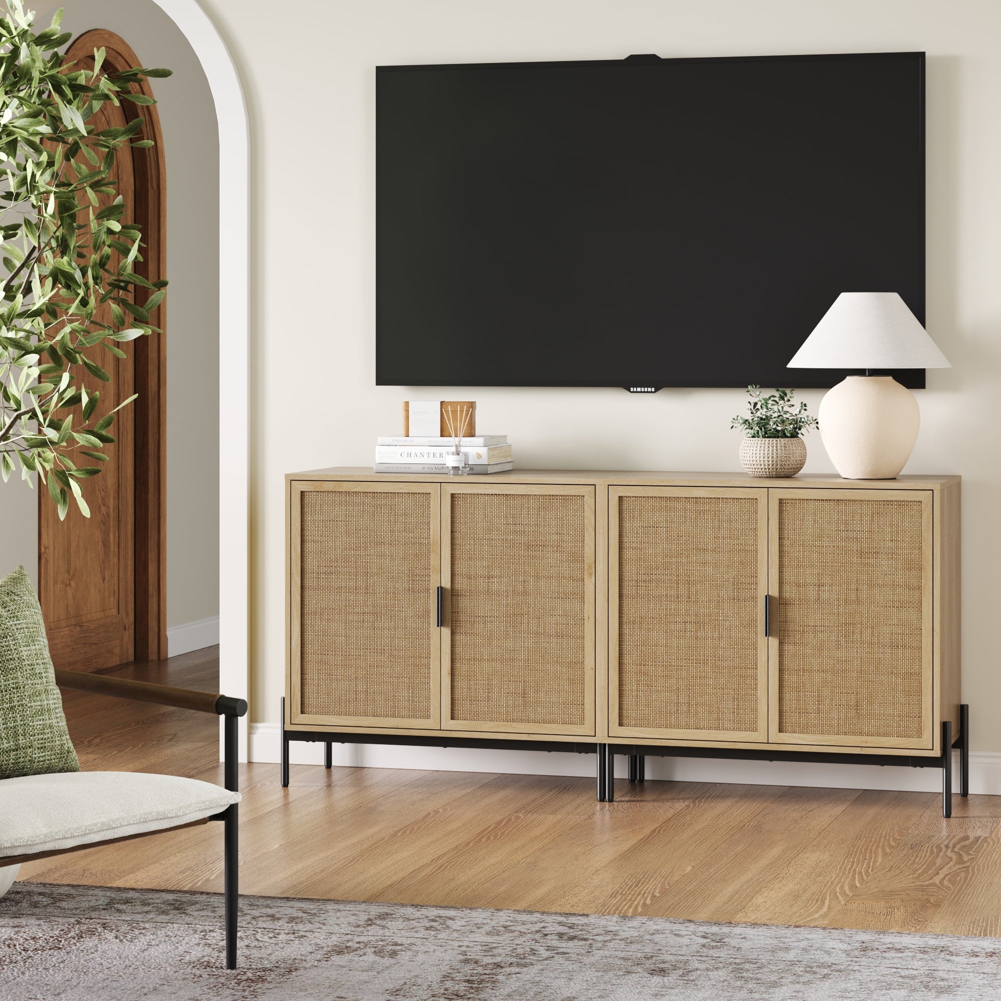 Meet the Andrew Storage Cabinet. where boho vibes blend perfectly with modern touches. It's built with a sturdy sleek metal base and has unique rattan doors that bring a warm. natural look – no two are exactly alike! Designed with versatility in mind. the cabinet features interchangeable legs. enabling a seamless setup alongside other units for a perfectly flush. cohesive look. This cabinet's not just about storage; it's a fun way to add some personality to your space. It's practical. stylish. and brings bohemian. laid-back feel to any room!