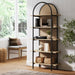 Get ready to fall head over heels for the Amara Bookshelf—the epitome of boho elegance! Constructed with love. this bookshelf features a sleek metal frame with an eye-catching geometric arch design in a trendy black finish. Its five thick shelves are perfect for showcasing your cherished books and adding a personal touch to your space. The back panel is crafted with on-trend durable textilene rattan. infusing your room with that irresistible boho vibe. Safety is a priority too. as we include a tip restraint kit to keep your bookshelf securely anchored to the wall. Let our Amara Bookshelf be the answer to your home's storage and style needs!