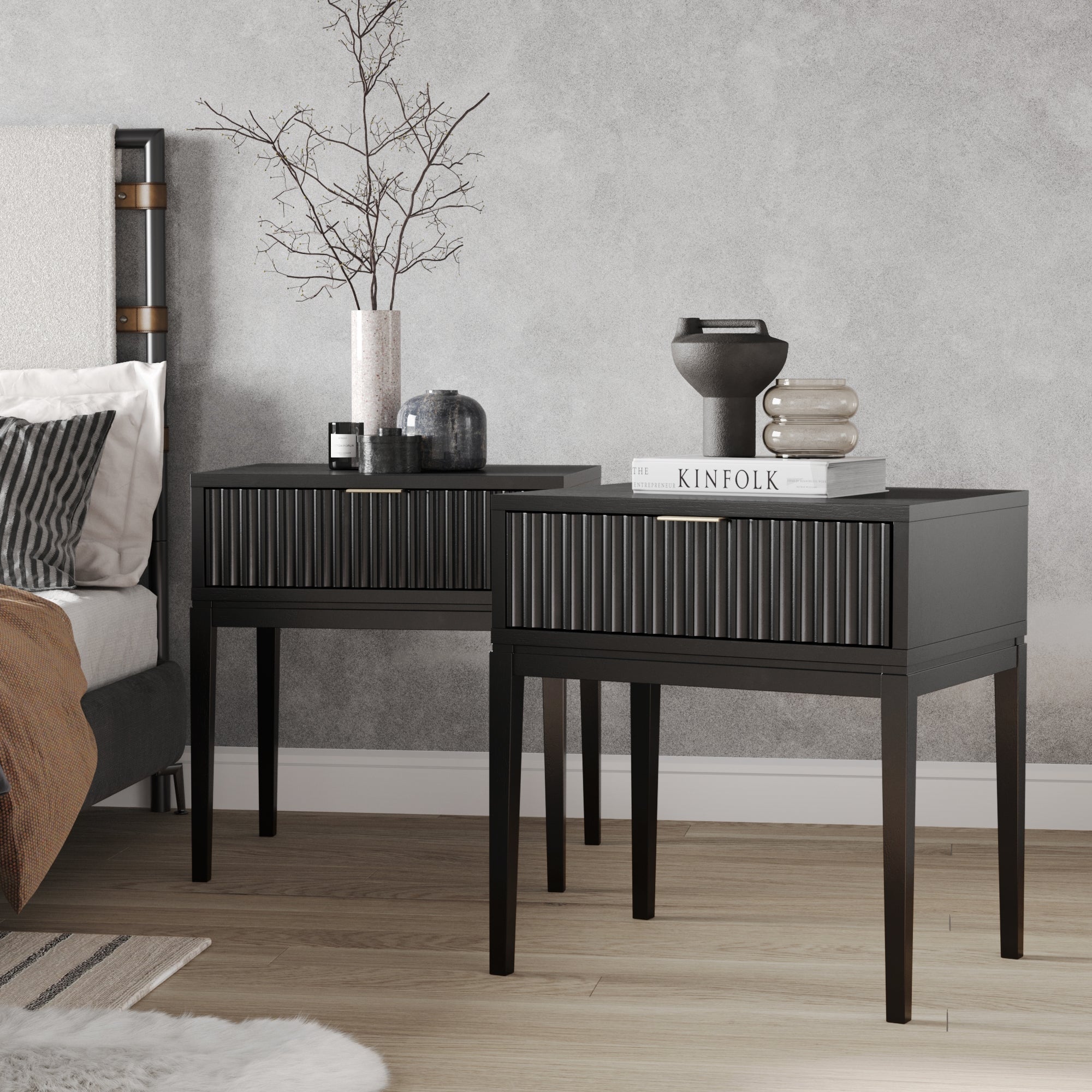 The perfect place for your bedside essentials. Meet Jasper! Jasper features a fluted drawer front in a black oak finish and tapered legs that balance the sleek profile. This bohemian-inspired nightstand effortlessly blends beauty with functionality. The front drawer boasts a simple and stunning brass color handle that opens to reveal deep storage to help keep your items organized. Use it in the living room. entryway or bedroom—this nightstand is as versatile as it is stylish.
