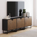A Bali hide away. The Enloe TV cabinet set features brushed fir wood veneer doors that have a geometric design for a natural rustic feel. The cabinets are supported by durable matte black metal legs that have footpads attached to keep your floors from being scratched. With two swinging doors per cabinet and high end triangular hardware. these cabinets offers plenty of hidden storage and enough space to keep your home clutter-free.