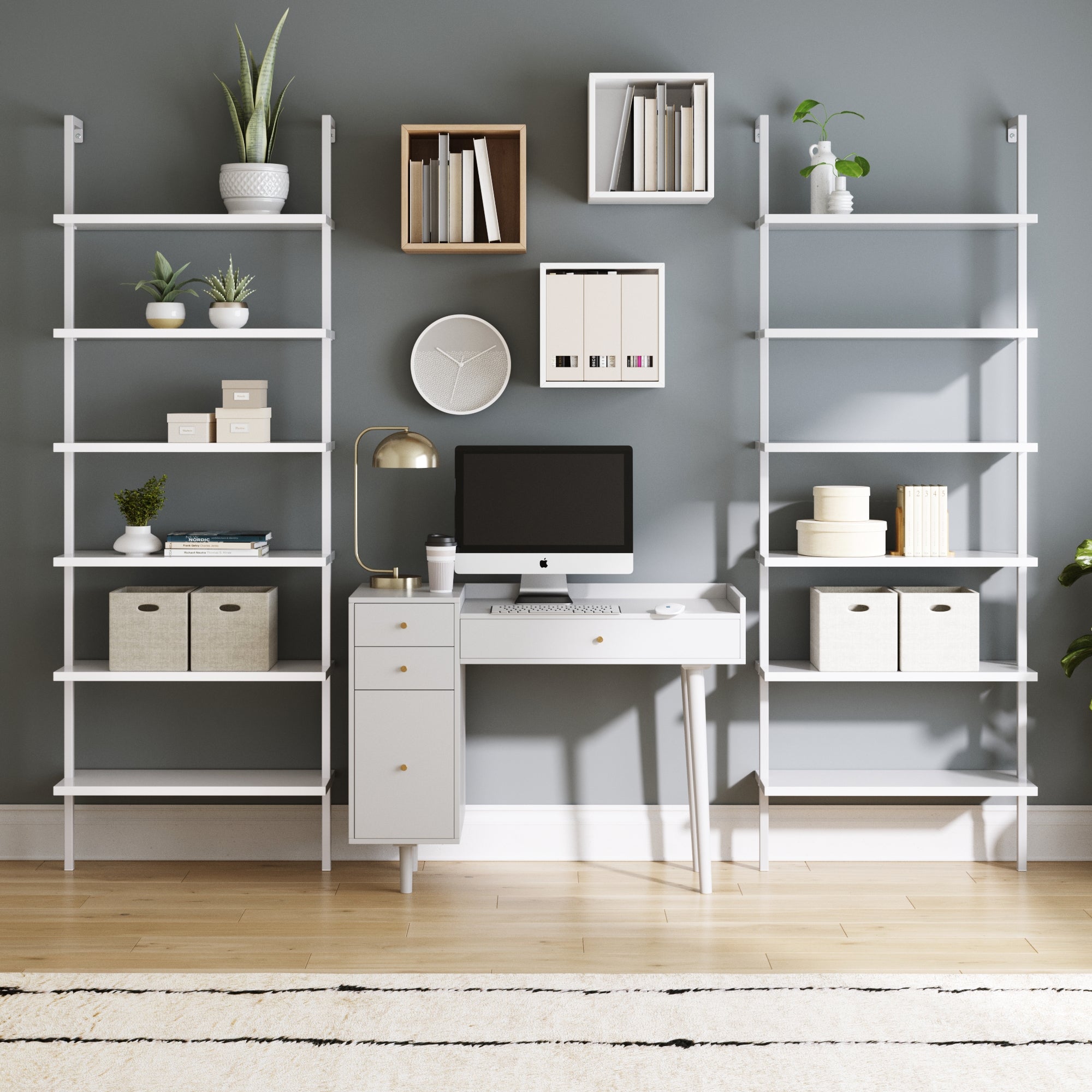 All white with a hint of sass—we mean brass. Meet our Daisy + Theo wall desk unit. Inspired by mid-century living. Daisy is a versatile desk with four storage compartments featuring small brass knobs. Sturdy tapered legs allow this desk to hold up to 66 lbs. while also making it the perfect place to store makeup. books. or office supplies. Its tray edge table top ensures that your makeup brushes. pencils. and snacks don't fall off. Whether you're putting yourself together for an afternoon Zoom call or helping your kids through their science homework. the Daisy + Theo desk unit will give your home office or dressing room a chic upgrade.