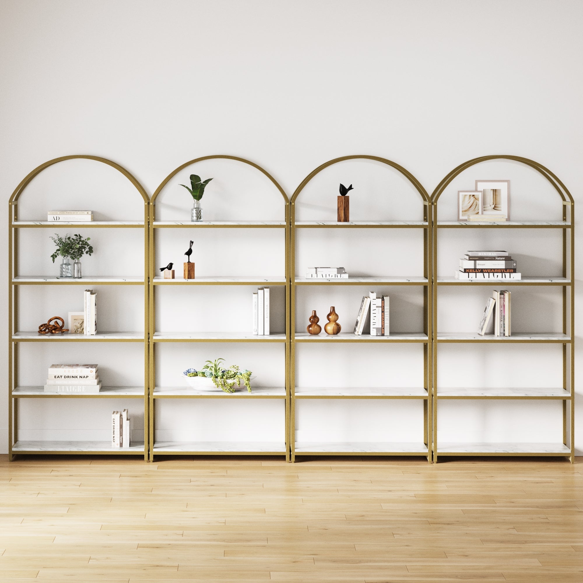 Our beautiful Haven etagere bookcase features five faux white marble shelves elevated on a gold metal frame. The sleek and durable frame is topped with an arched design that's sure to make a statement. Its minimal silhouette fits perfectly in any home. bringing style and storage to your space. Complete the look with your favorite books and house plants for that picture-perfect shelfie moment.