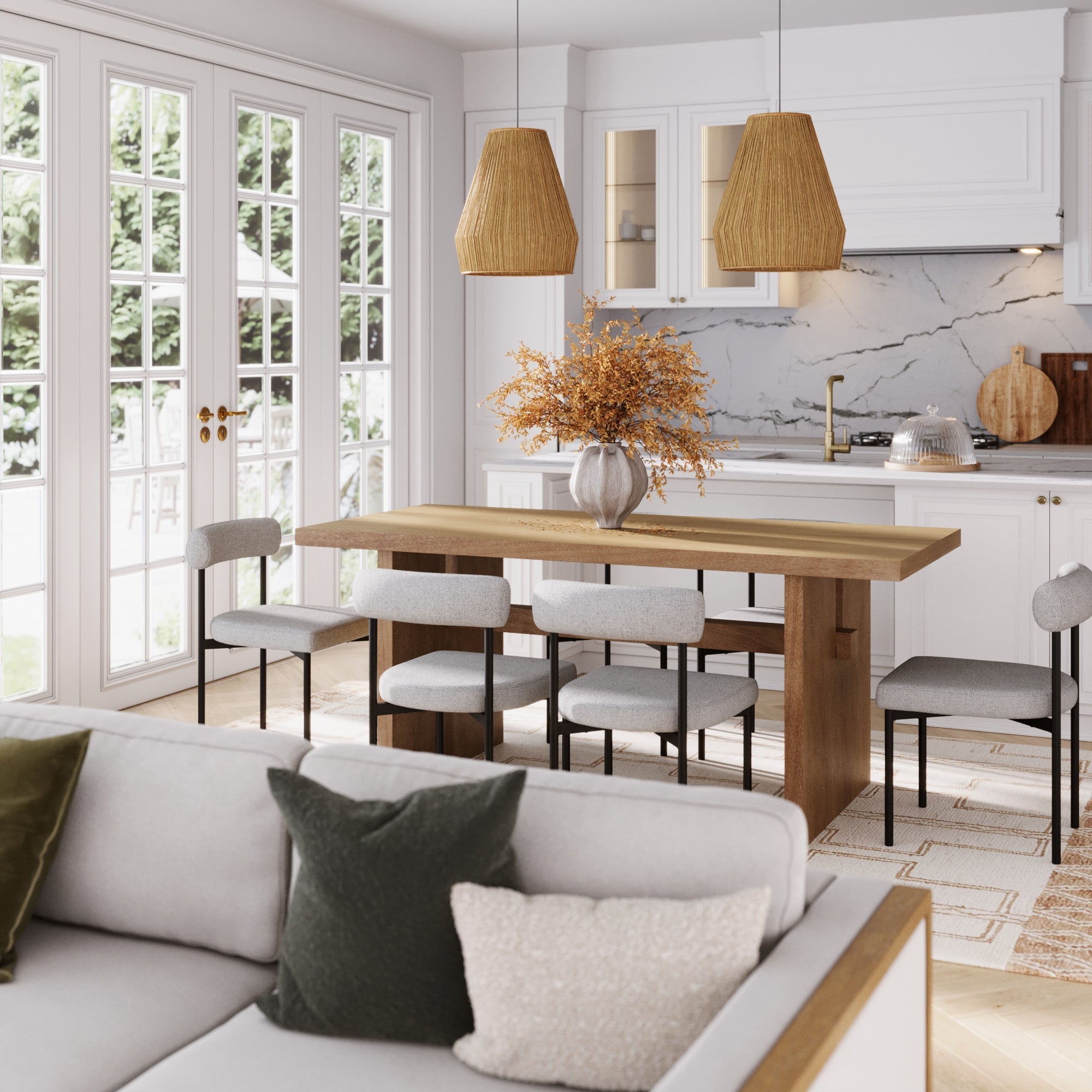 Introducing our latest dining set: the perfect blend of style and function for your home! The Briggs dining table comfortably seats six and features a durable. thick-panel construction topped with a beautifully veneered surface—each table is unique with its own variations in color and texture. Paired with the Dahlia dining chairs. you'll enjoy mid-century inspired wire frames. curved backs. and cushioned seats that make every meal a pleasure. Plus. with easy assembly. you'll be hosting in no time. Make your dining area a warm and welcoming space with this charming set! Set includes 1 dining table and 6 chairs.