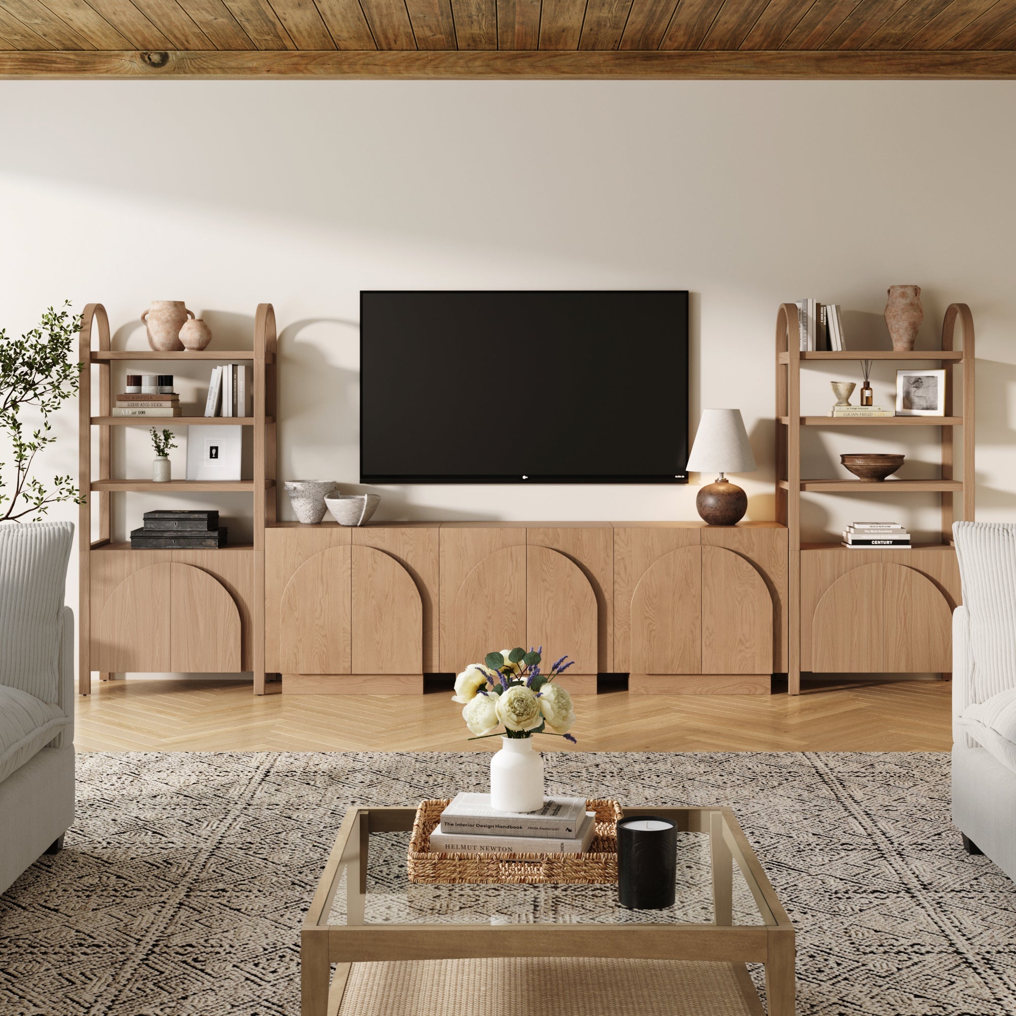 Create the perfect setting for cozy nights in with the Iris Mid-Century Modern Arched Wood Entertainment Center — a romantic blend of timeless design and modern function. With three elegant cabinets and two matching bookshelves. this beautifully crafted set frames your TV like a work of art. The gracefully arched doors add a soft. vintage charm. while the spacious storage keeps your media essentials neatly tucked away.