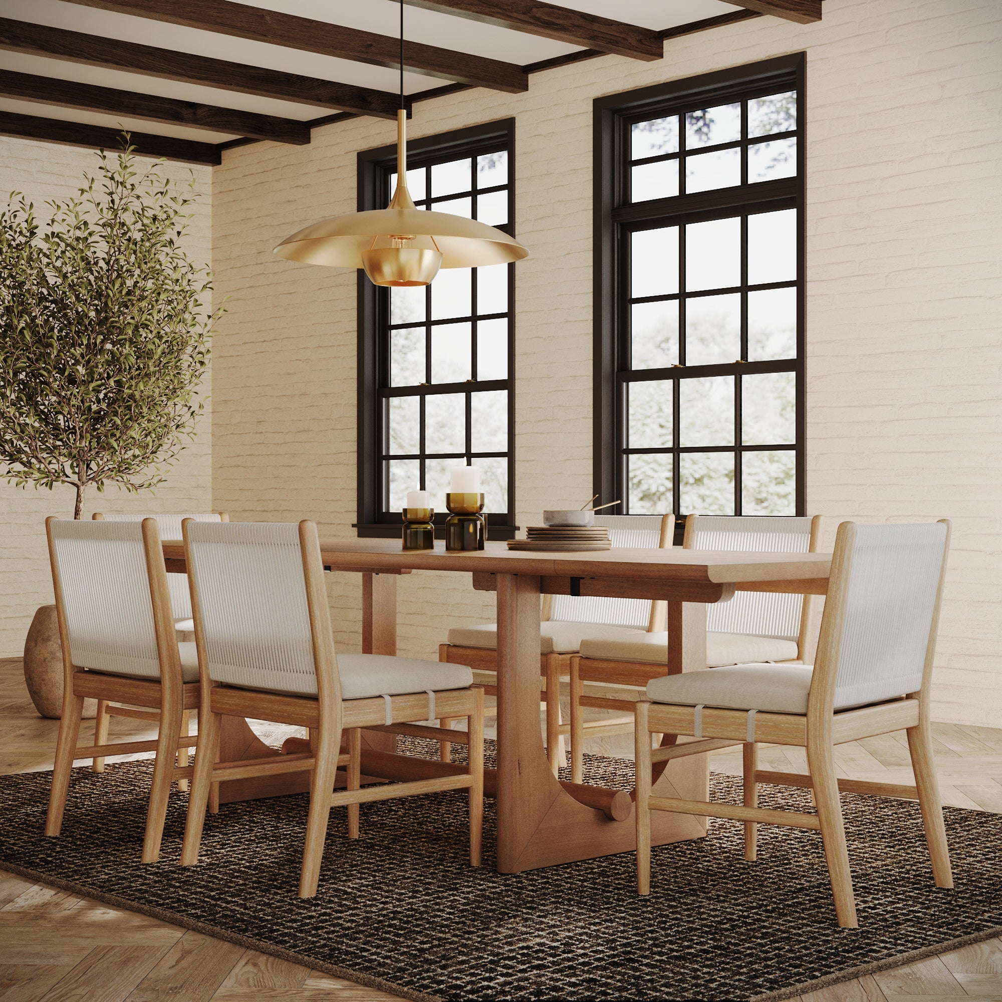 Gather in style around the Solace Dining Table— with an extension that allows to seat up to 8. Its solid wood U-shaped legs and unique round stretcher create a sturdy yet standout base. while the thick tabletop features smooth rounded edges for a softer. inviting feel. Casual. modern. and made for connection. Solace is the kind of table everyone feels at home around.