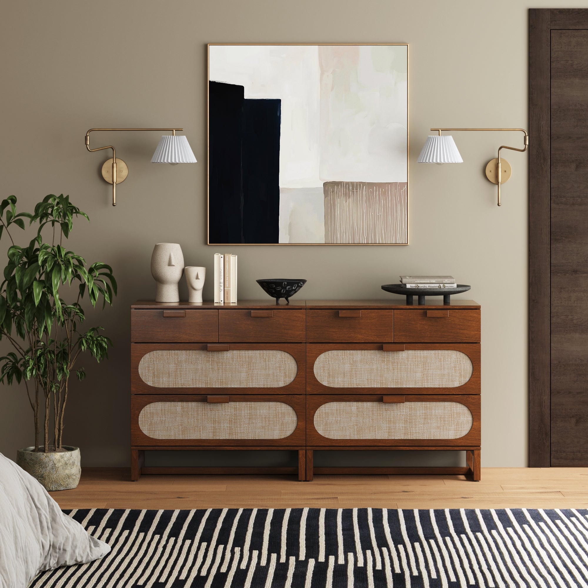 Our new Paxton Dresser is the perfect blend of style and functionality! Featuring solid wood drawer pulls and a sturdy base. it's built to last. The three drawers glide smoothly on metal slides. with the top left and right drawers opening as a single. spacious compartment for extra convenience. The faux rattan inlays add a touch of texture and warmth. while the natural wood construction means each piece is one-of-a-kind. with unique variations in color and grain. It's a beautiful and functional addition to any room!