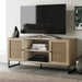 Say hello to Mina. the unit that offers hidden storage as well as beauty and warmth. This media unit combines a sturdy MDF oak finish frame. featuring 2 textured rattan-panel doors for a trendy. textured look. Doors are adorned with a stylish metal handle allowing you easy access to your belonging while the flat top surface is the perfect area for houseplants. books and other decorative accents. Open shelving makes room for your stereo or gaming system. with conveniently located cable management to run cords in the back of the unit. The cabinet doors feature adjustable shelves so you can create just the right amount of space that best suits your needs. This classic double-door cabinet can easily blend into a variety of decor aesthetics. enhancing the look of any room. The look is finished with sturdy powder-coated metal legs. • Recommended Minimum TV Size (Diagonal): 49" • Only the left and right shelf heights is adjustable and the center shelf is fixed • Recommended Maximum TV Size (Diagonal): 53"