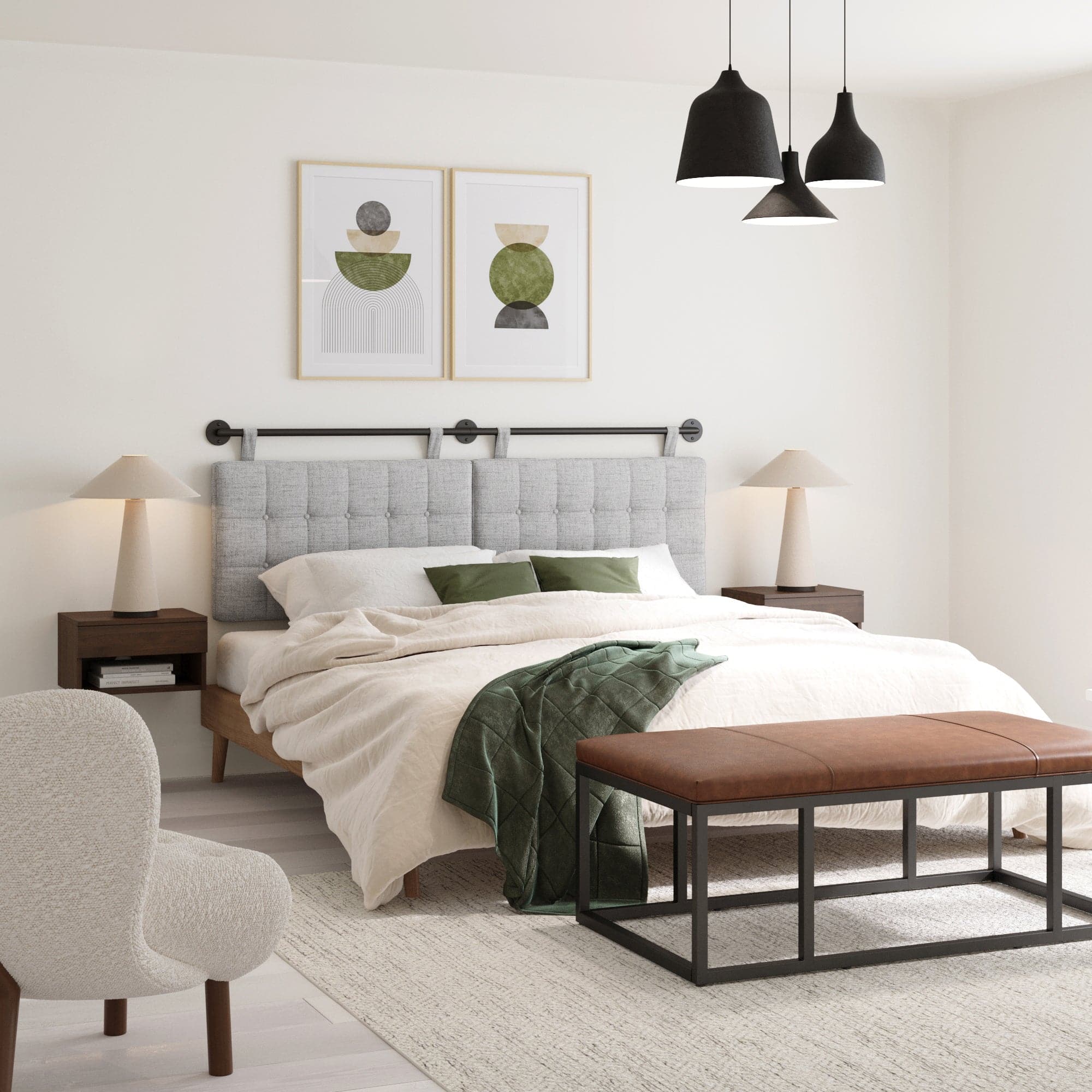 Sweet dreams just got sweeter. Remi features button tufted panels in a light grey finish and is paired with a sleek black metal rail. Its matching light grey straps allows it to be hung at any height. making this headboard versatile enough for guest rooms. kids rooms. or master suites. Or get creative and hang this King size headboard in your kitchen nook. dining room or entryway!