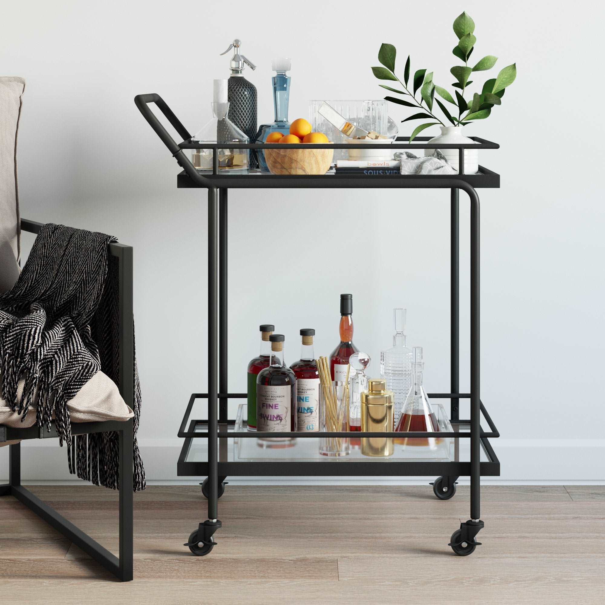 Sally's sleek rounded frame is adorned with tempered glass shelves. allowing it to be dressed up for when hosting season comes around. The curved. raised handle makes moving Sally a breeze and its four easy-glide wheels means Sally goes where you go! Its black metal frame and built-in rails ensure no party fouls occur. while the metal lock on the back wheels means you'll never have to worry about your bar cart going rogue.