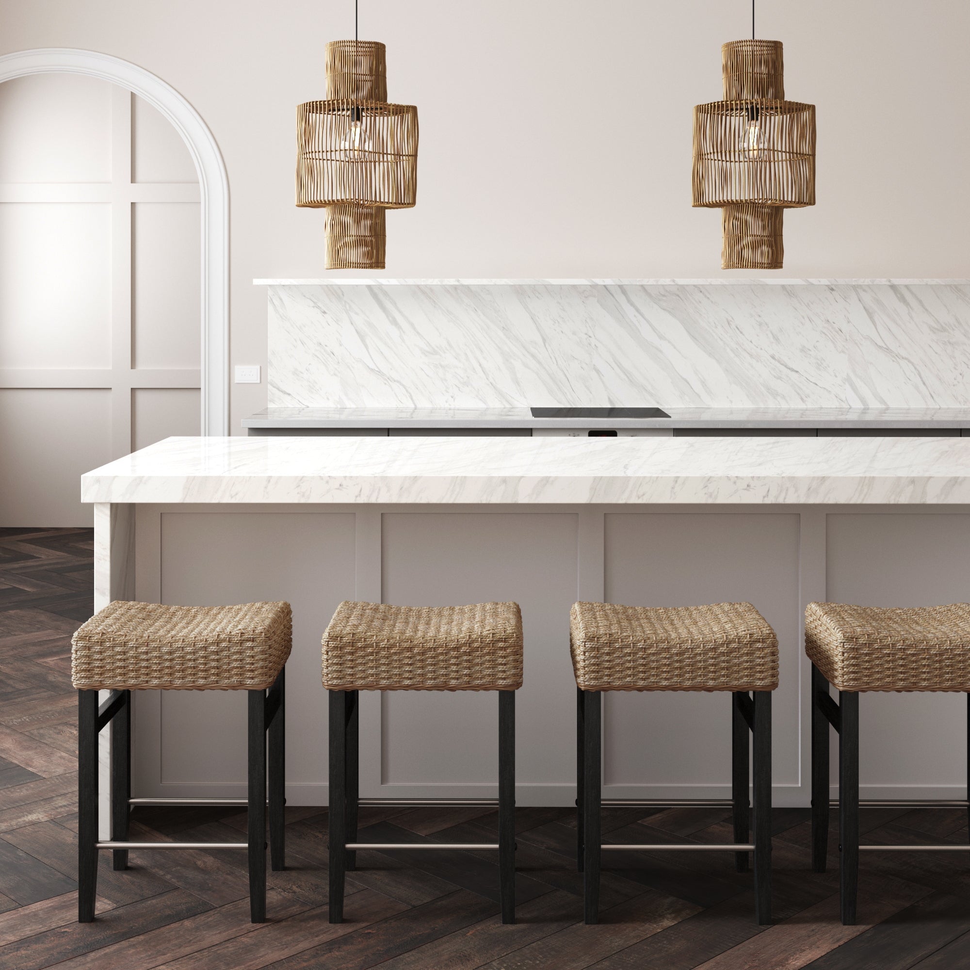 Crafted with a saddle seat shape. the Harvey Bar Stool ensures maximum comfort for extended seating. making it perfect for leisurely meals or casual gatherings. Whether you're enjoying a quick morning coffee or hosting a dinner party. the Harvey Bar Stool will elevate your seating experience with its style and comfort. It features a woven seagrass seat that brings a natural and earthy vibe to your space. while its black legs with a wire-brushed finish add a touch of modern fun. Plus. the chrome stretcher footrests make the stool sturdy and long-lasting. Bon appétit!