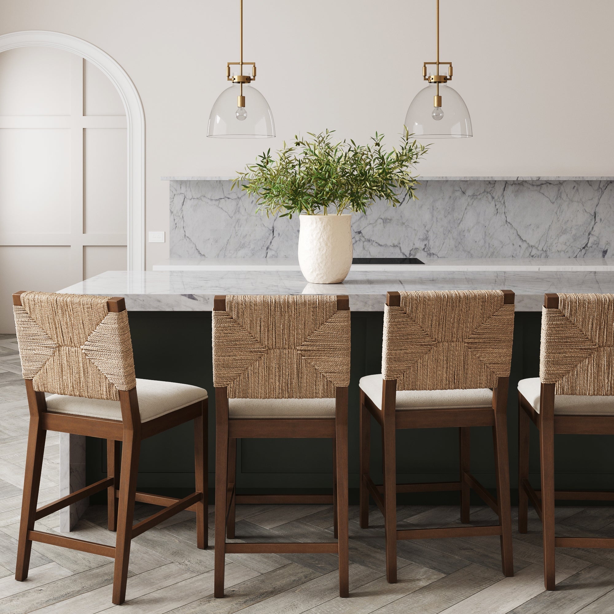 Introducing the Beacon Bar Stool—where comfort meets style right at your counter! With its natural seagrass woven backrest. you'll be reminded of breezy seaside getaways. while the plush textured boucle seat promises endless hours of comfort. And let's not forget its solid wood frame. which doesn't just offer durability but also adds that classic touch to your space. Whether you're sipping morning coffee or enjoying a late-night snack. the Beacon Bar Stool is your perfect companion. Pair with the other pieces in our Beacon collection for the perfect matching set.