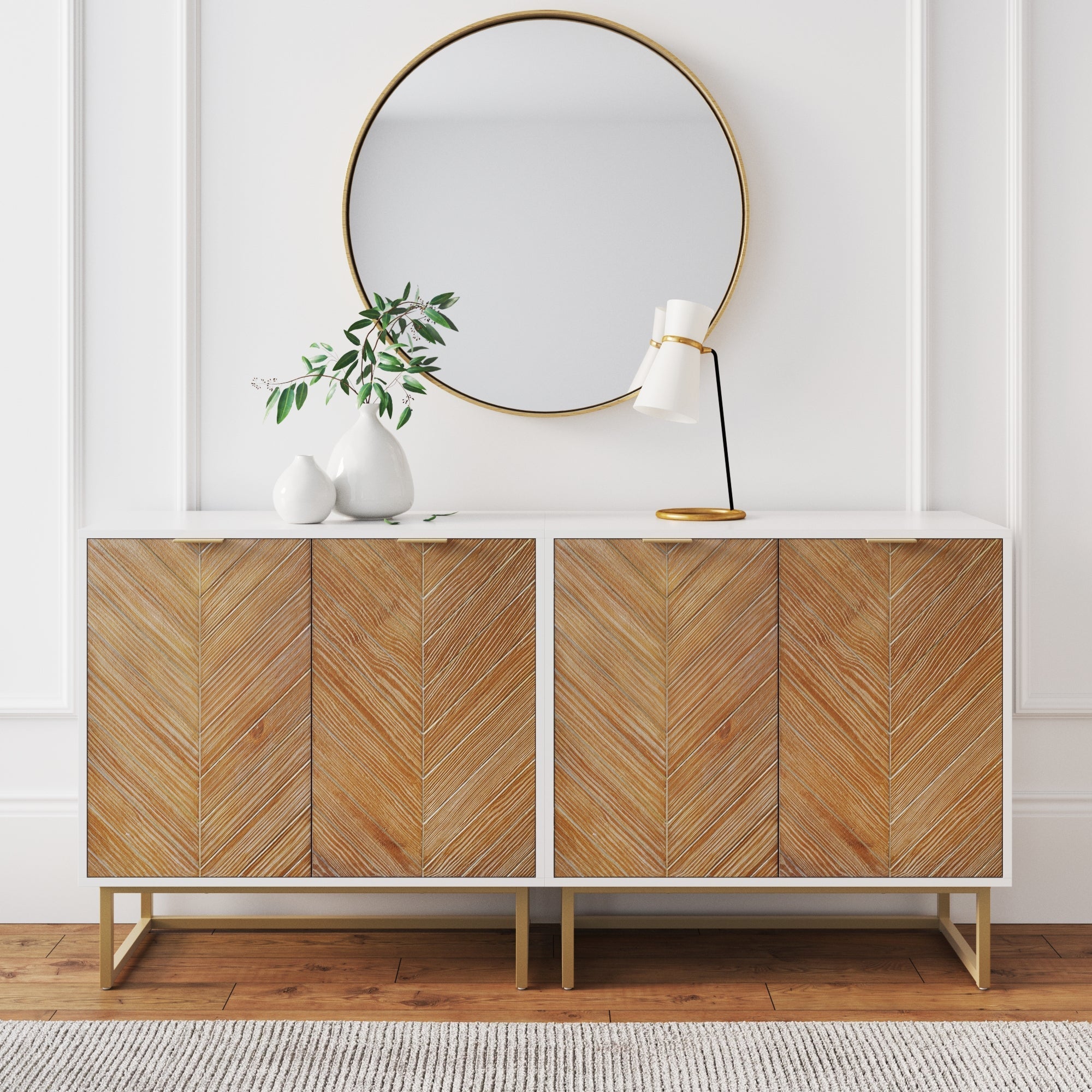 A beautiful hideaway. The Enloe console table features rustic solid wood doors that have beautiful herringbone design juxtaposed against clean white painted frames for a modern meets rustic feel. This set of 2 cabinets are held up on beautiful brass powder coated legs that have footpads attached to keep your floors from being scratched. With two swinging doors. these cabinets offer plenty of hidden storage and enough space to keep your home clutter-free.