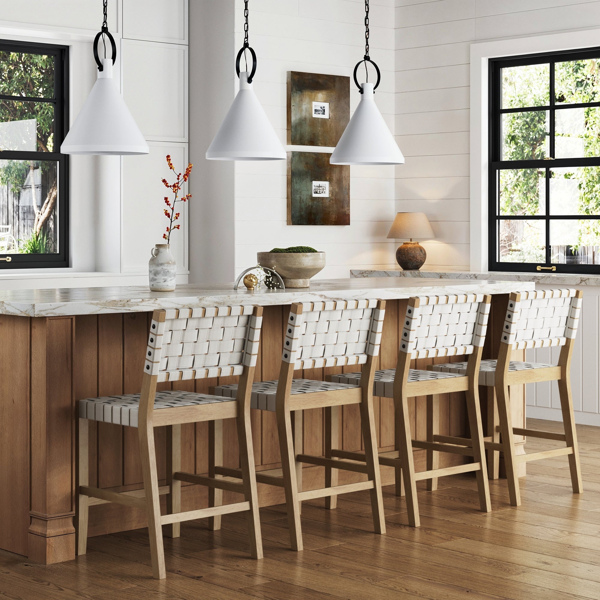 We can't help but rave about the Cohen counter stool! This mid-century modern piece features a solid white oak wood frame that exudes warmth and character. with each piece boasting unique variations in color and texture. The off-white woven faux leather back and seat offer a chic and comfortable perch. perfect for any kitchen counter area. Standing proudly at a 24" seat height. the Cohen stool combines durability. style. and a touch of individuality. making it a standout addition to any space. Embrace the natural beauty and sleek design that the Cohen brings to your home!