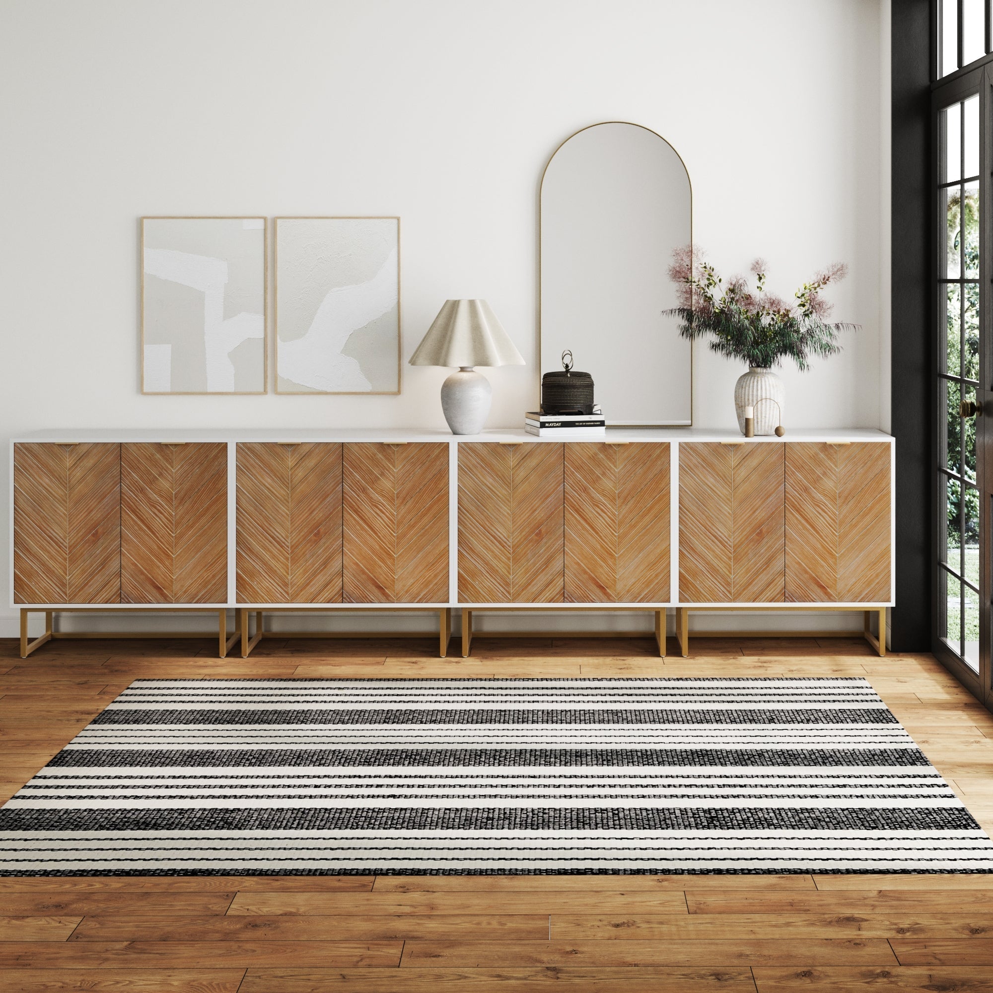 A beautiful hideaway. The Enloe storage cabinets feature rustic solid wood doors that have beautiful herringbone design juxtaposed against clean white painted frames for a modern meets rustic feel. This set of 4 cabinets are held up on beautiful brass powder coated legs that have footpads attached to keep your floors from being scratched. With two swinging doors. these cabinets offer plenty of hidden storage and enough space to keep your home clutter-free.
