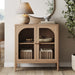 Meet Mason. the modern farmhouse storage cabinet of your dreams. Its rounded frame edge and brass finish hardware combine to create the perfect statement piece for your farmhouse-style home. And let's not forget that raw oak interior – it's like the warm hug your belongings have been waiting for. Those curved glass doors? They're practically saying. "Put your books. fancy glassware. or your collection of quirky gnome figurines on display here!" Oh. and here's a pro tip: Double the storage and style by placing two of these beauties side by side.