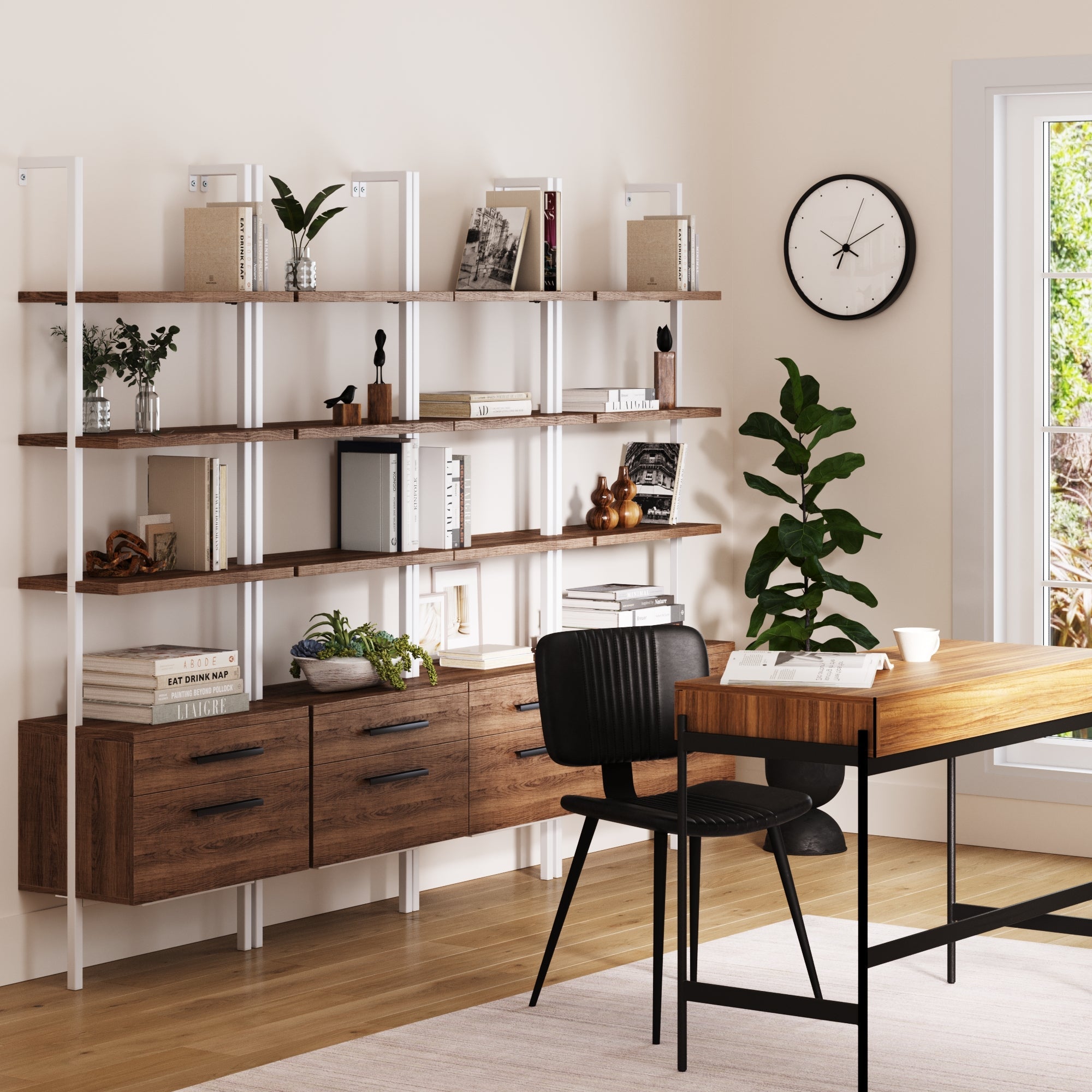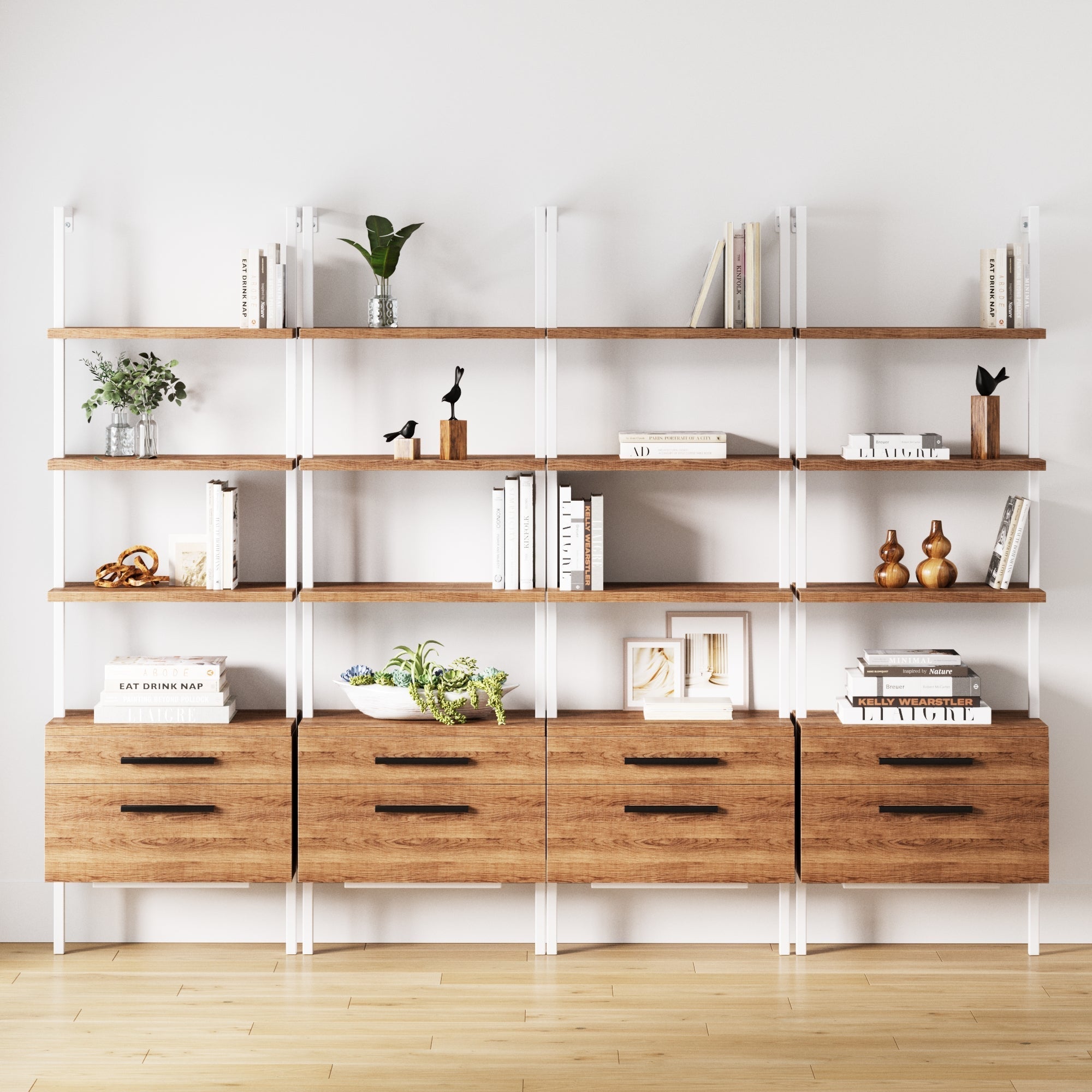 Bring your storage game to a new level. Starting from top to bottom. the Theo storage bookcase provides a minimalist open-design style with a strong frame. durable particle board shelves. and easy to glide drawers to tuck away everything from books to those wires you've been holding onto just because. Theo was designed for optimizing storage and display potential. it will help keep your home clutter-free and be your space-saving solution while displaying all of your collectibles.