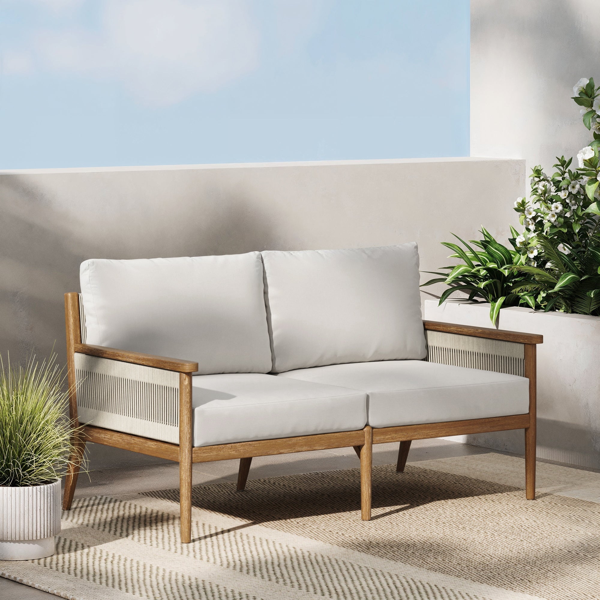 Meet the Kayden Loveseat—the perfect match for your outdoor sanctuary. Embracing the same bohemian charm as its chair counterpart. this loveseat elevates your outdoor lounging to a new level of style and comfort. The frame. with its brushed light brown finish. radiates warmth and earthiness. Wrapped with light gray polyester rope details. the loveseat adds a touch of artisan elegance. making it a standout piece. But where Kayden truly shines is in its comfort. The loveseat is adorned with plush. inviting cushions. covered in a resilient light gray fabric that's perfect for any outdoor setting. It's spacious enough to share. yet cozy enough for those moments of solitary relaxation. Whether you're enjoying a sunset with a loved one or lounging with a good book. the Kayden Loveseat is your go-to for outdoor comfort and style.