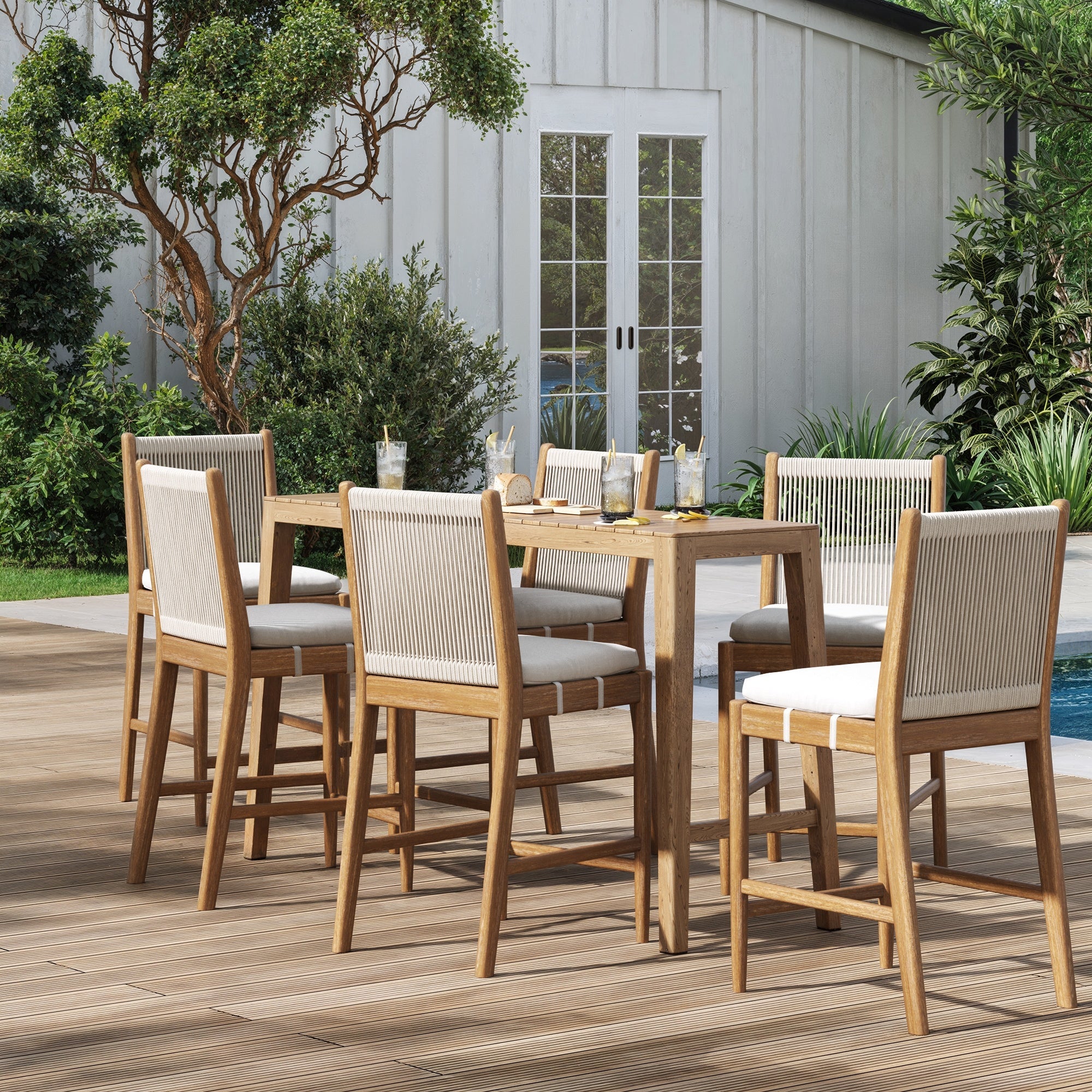 Bring home the perfect mix of style and comfort with the Kayden Outdoor Bar Stool Set of 4! Designed with solid wood frames. these stools are sturdy enough for both indoor and outdoor lounging. The woven rope backrests add a breezy. modern touch. while the upholstered seat cushions provide plush. all-day comfort. Because they're made from natural wood. each chair has its own unique color and texture. making every set one of a kind. Whether you're hosting friends. enjoying family time. or just soaking up the sun. this set of four is perfect for any gathering. Stylish. durable. and oh-so-inviting. the Kayden stools are ready to make your space shine!