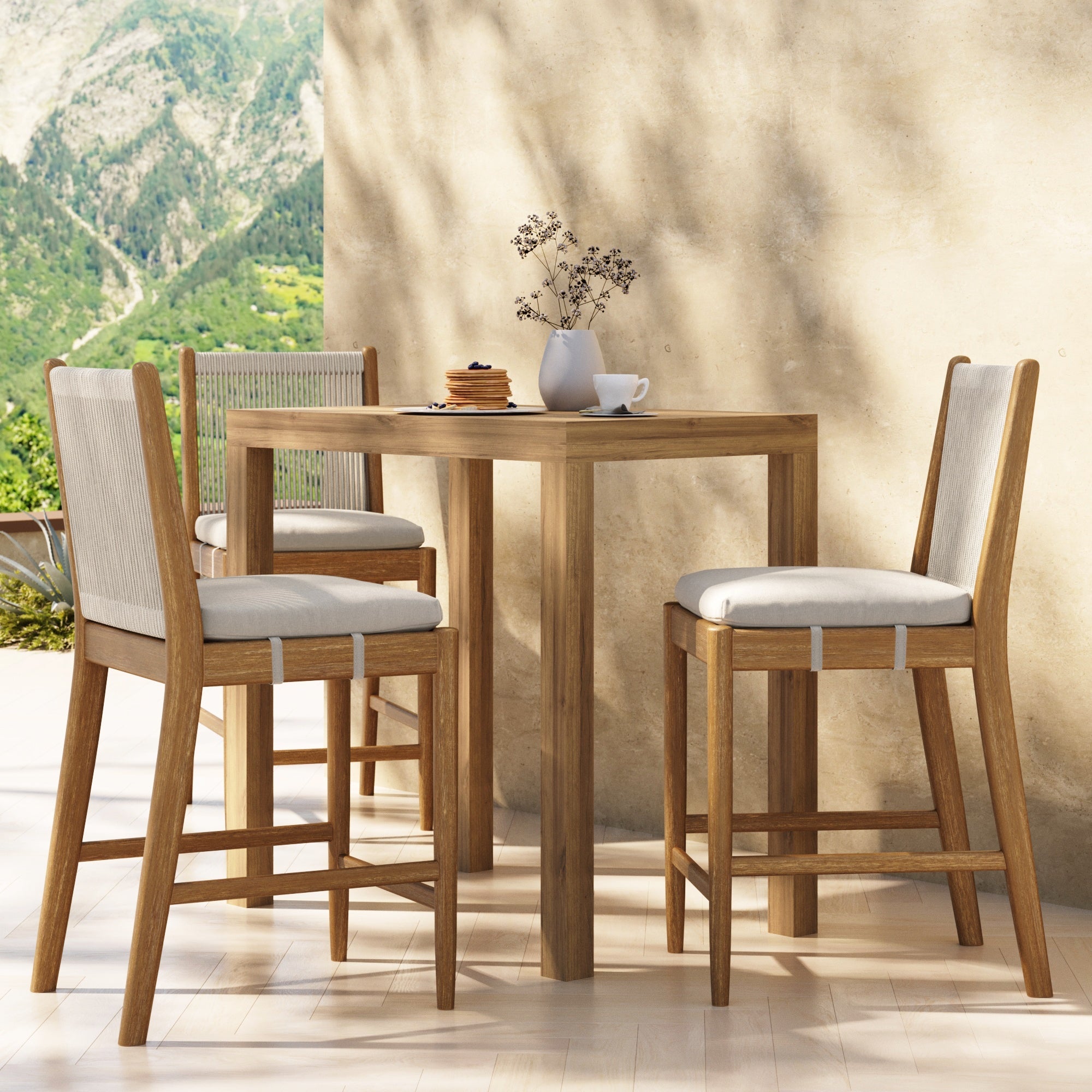 Triple the style. triple the comfort—say hello to the Kayden Outdoor Bar Stool Set of 3! Crafted with solid wood frames. these stools are built to last. whether you're lounging indoors or soaking up the sun outside. The woven rope backrests bring a breezy. modern vibe. while the upholstered seat cushions offer plush comfort for endless relaxation. Since each piece is made from natural wood. every stool in the set has its own unique color and texture. Perfect for gatherings. cozy chats. or simply enjoying the view. this trio is made for great moments. With the Kayden set. your outdoor (or indoor) space just got a whole lot more inviting!